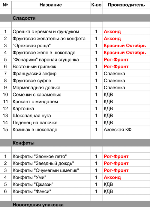 Картошка (1 шт), "Фонарики" вареная сгущенка (1 шт), Восточный грильяж (1 шт), Семечки с карамелью (1 шт), Конфеты "Звездный дождь" (1 шт), Конфеты "Очумелый шмелик" (1 шт), Конфеты "Звонкое лето"(1 шт)